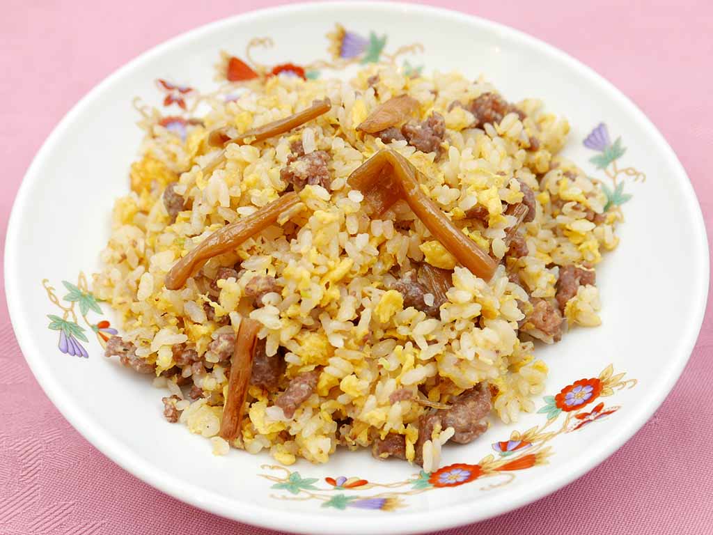 ●粗挽き牛肉とニラ漬物のチャーハン