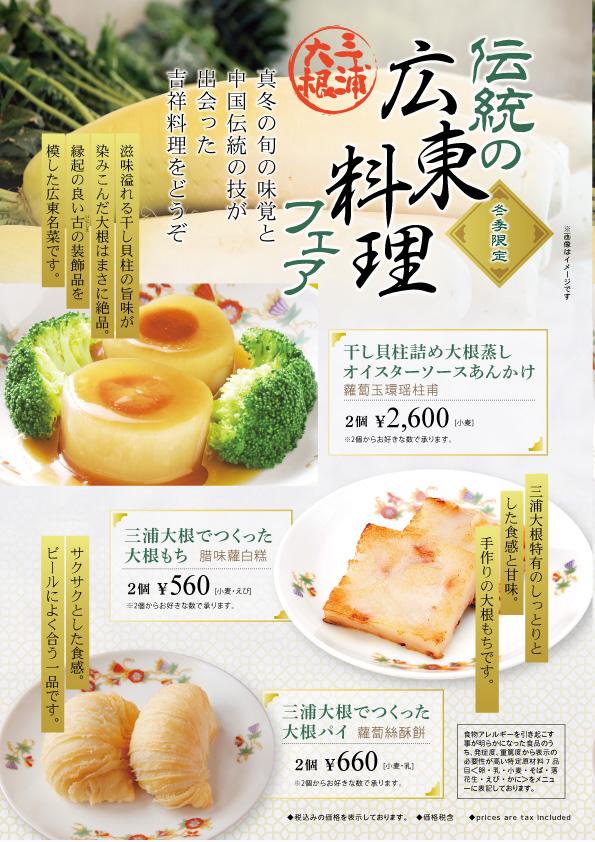 地の旬のお野菜をつかい、広東料理で表現します! 希少な三浦大根と料理人のコラボレーションから生まれる、多様なおいしさをお楽しみください。